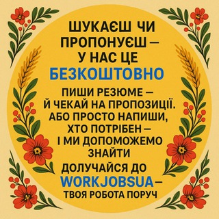 Шукаєш чи пропонуєш роботу — у нас це БЕЗКОШТОВНО! Пиши резюме — й чекай на пропозиції. Або просто напиши, хто потрібен — і ми допоможемо знайти! Долучайся до WorkJobsUa — твоя робота поруч.