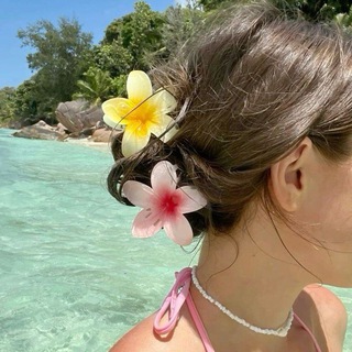 wearing a pretty pink bikini with a hibiscus-patterned cloth covering her lower body and using a hibiscus clasp in her hair.🌺