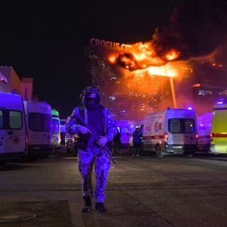 A member of the Russian Rosguardia (National Guard) secures an area as a massive blaze is seen over Crocus City Hall on the western edge of Moscow, Russia, Friday, March 22, 2024. Russian state media reported that several gunmen attacked the venue as crow