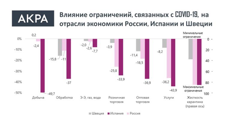 Эксперты АКРА сравнили влияние ограничительных мер на экономики России и Испании, степень жесткости карантинных мер в которых приблизительно сопоставима. По оценкам АКРА, потери годового ВВП за апрель составили -1 п. п. для России, -1,5 п. п. для Испании. Сопоставимый спад в России и Испании наблюдается в таких отраслях, как сфера услуг и розничная торговля, тогда как степень влияния карантина на другие отрасли отличается. В частности, в Испании добывающая и обрабатывающая промышленность, а также оптовая торговля, показали более негативную динамику по сравнению с Россией.