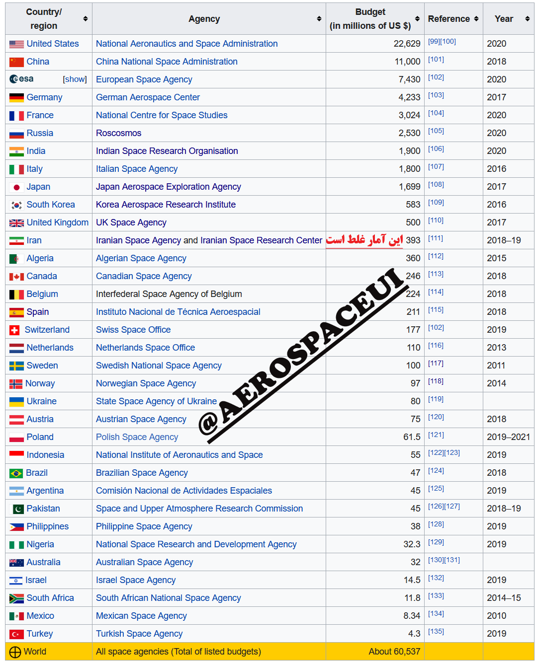 💠 ویکیپدیا، درست یک پله پایین تر از انگلستان و در رتبه دوازدهم، سازمان های فضایی کشور ما را قرار داده است. دو سازمان با نام های اختصاری ISA (با ISA ، سازمان فضایی رژیم صهیونیستی اشتباه گرفته نشود!) و ISRC که به ترتیب «سازمان فضایی ایران» و «پژوهشگاه فضایی ایران» هستند. عددی که به چشم میخورد، چیزی حدود ۴۰۰ میلیون دلار است که با توجه به برنامه فضایی و اقتصاد ایران، در نگاه اول رقمی معقول به نظر می رسد و یا حتی به نظر برخی برای ایران خیلی هم زیاد است.