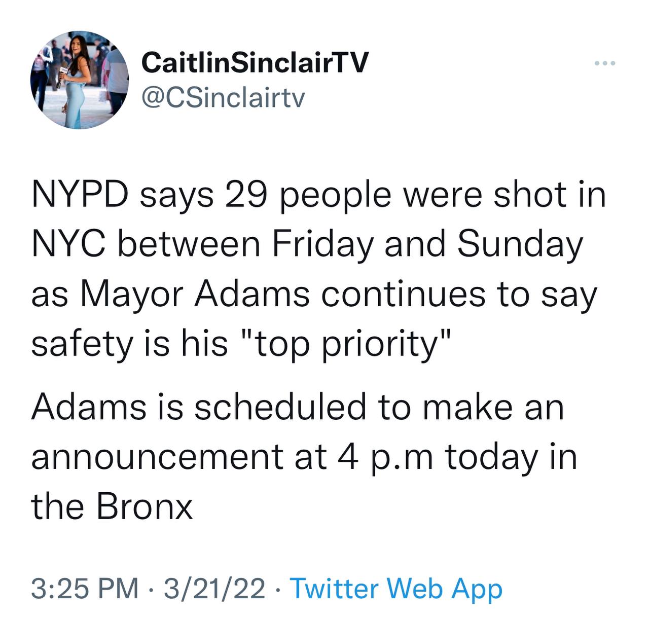 Caitlin Sinclair: NYPD says 29 people were shot in NYC between Friday and Sunday as Mayor Adams continues to say safety is his "top priority"