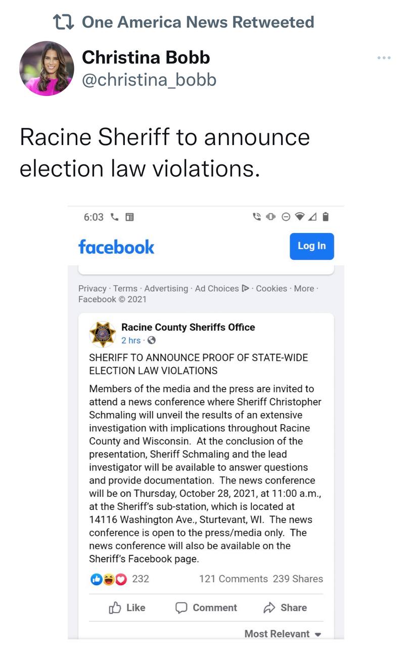 Racine County Sheriff to Announce Proof of State-Wide Election Law Violations During Press Conference 10/28/21 @ 11 a.m. Central