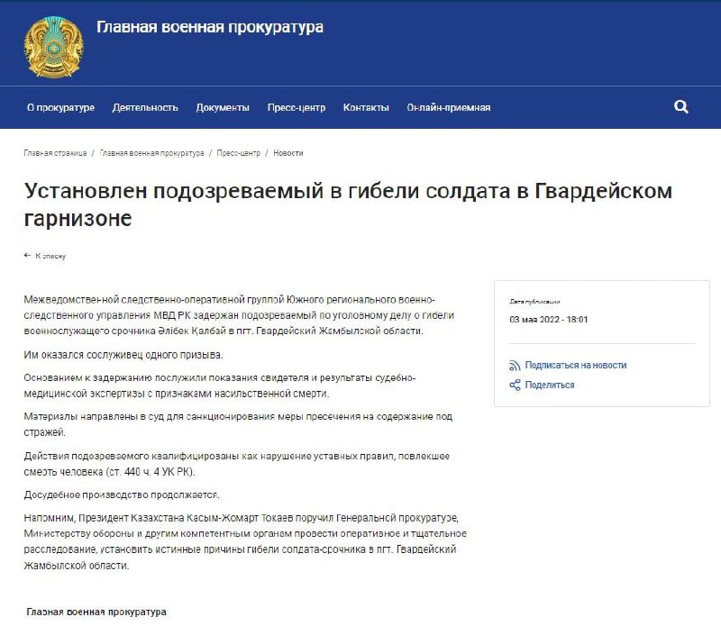Ранее президент Казахстана Касым-Жомарт Токаев поручал Генпрокуратуре, министерству обороны и другим компетентным органам провести оперативное и тщательное расследование, установить истинные причины гибели солдата-срочника.