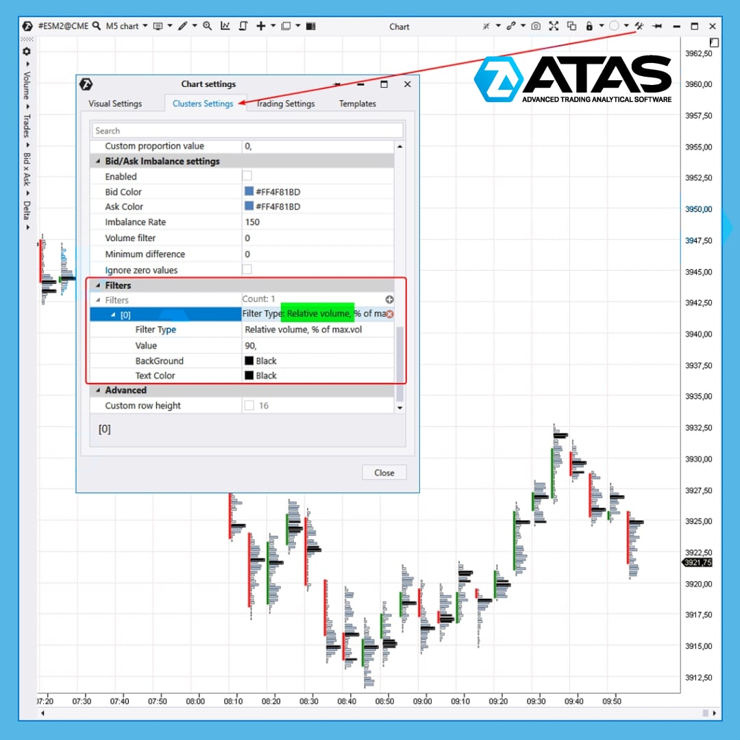 For example, the Relative Volume filter = 90% on the attached chart. It means that ATAS automatically finds the largest volume among all clusters loaded on the chart and takes its value as 100%. After that, all clusters whose volume is at least 90% of the maximum are painted black.