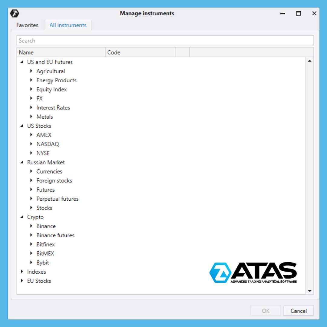 The ATAS platform allows its users to easily navigate various types of markets thanks to the instrument manager, where all instruments are carefully divided into six sections: