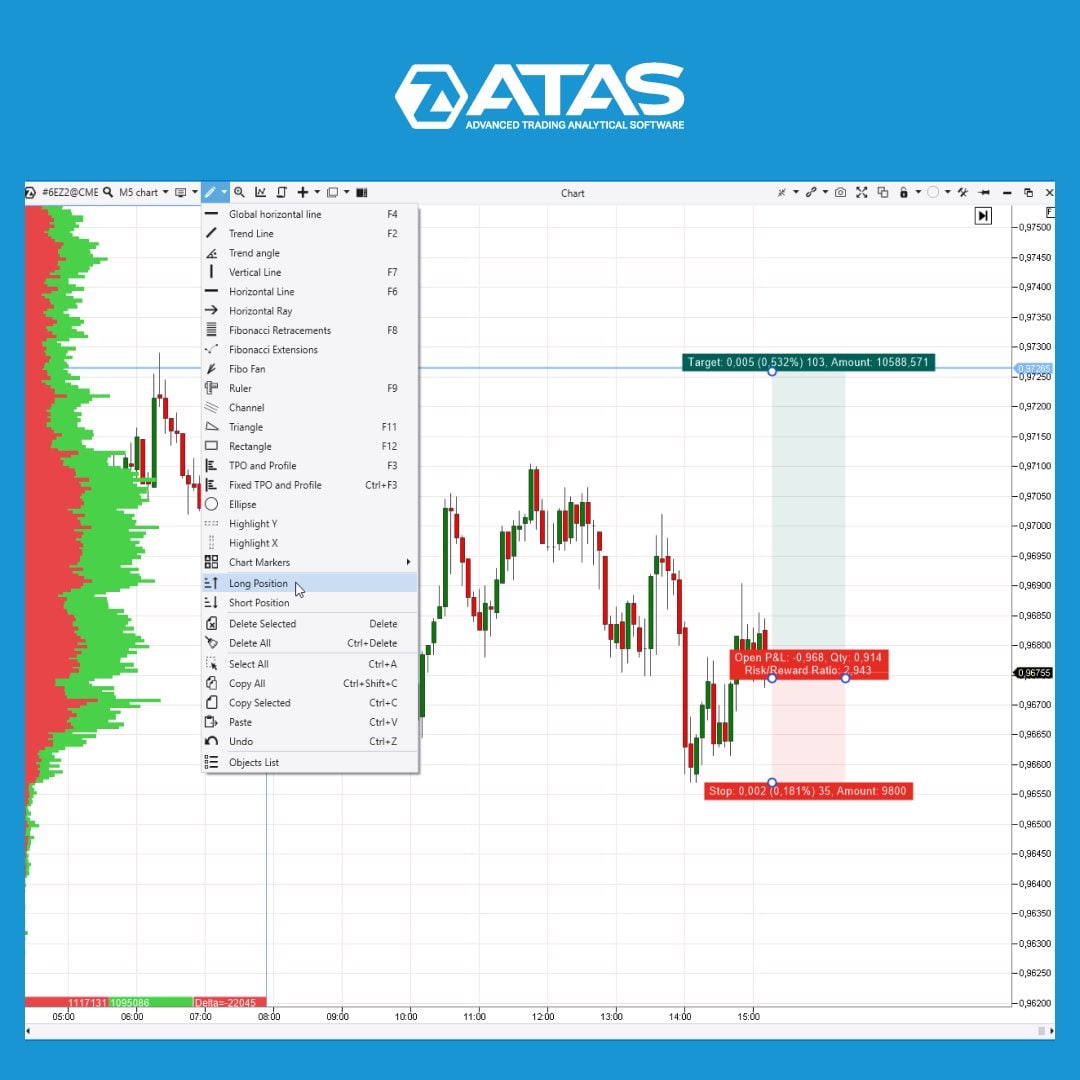 The ATAS platform will calculate the Risk:Reward ratio for you. It is desirable that it exceeds the ratio of 1:2.