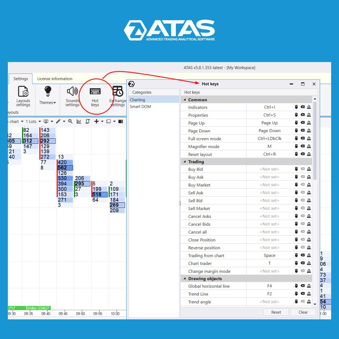 ATAS is a highly customizable software product. You can customize workspaces, charts, colors, and much more, including hot keys.