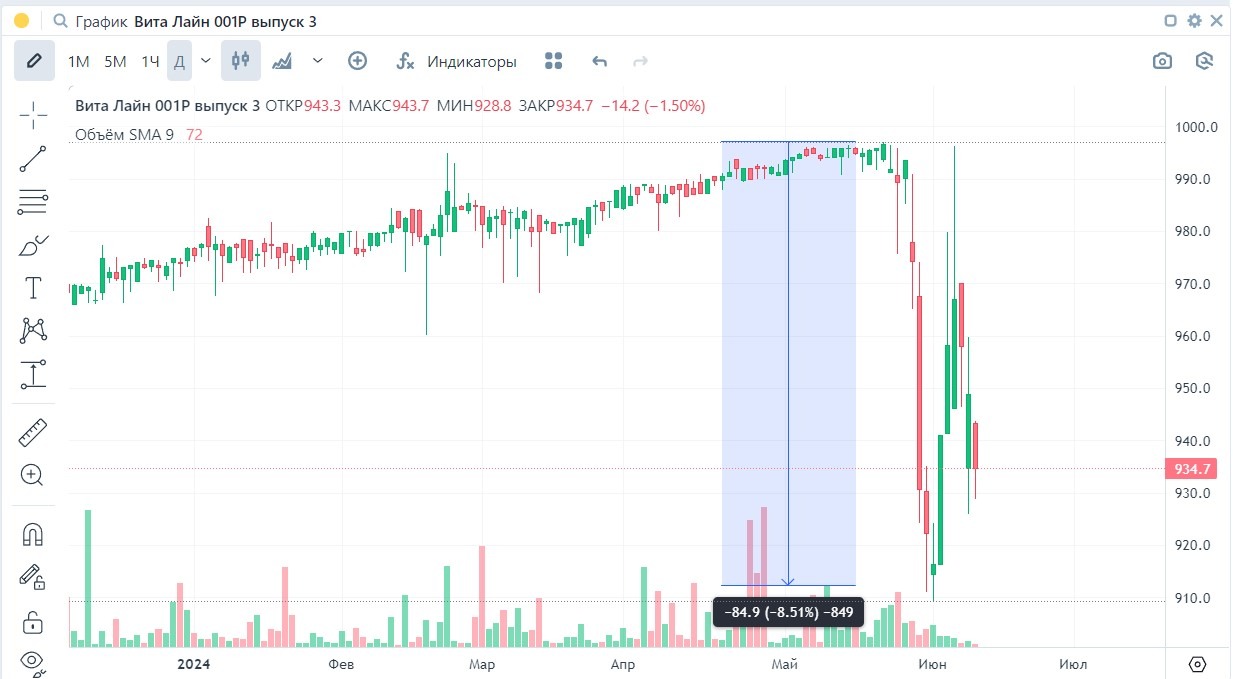 👇 В Вита лайн же примерно половина держателей осталась до погашения с купоном 10%. У аналогичных выпусков с аналогичным кредитным качеством требуемая рынком доходность ~19%, соответственно рынок быстро переоценил бумаги и опустил котировки на -8,5%. Почему так мало? Маленькая дюрация.