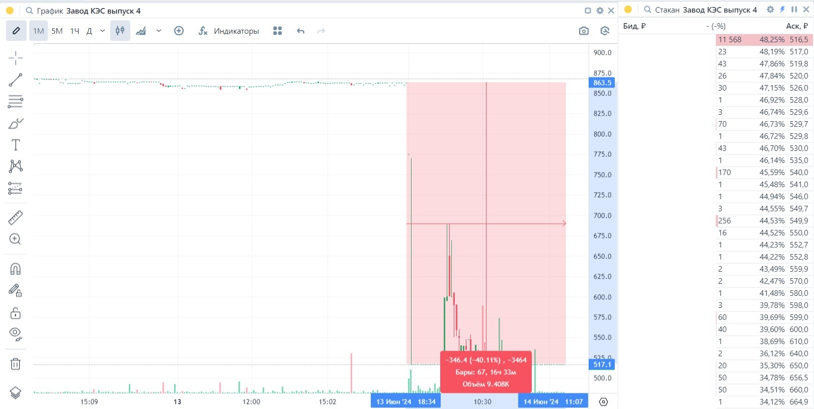 У эмитента в обращении 4 выпуска на общую сумму 750 млн руб. Все они сегодня упали до -40%, дальние выпуски стоят в нижних планках.
