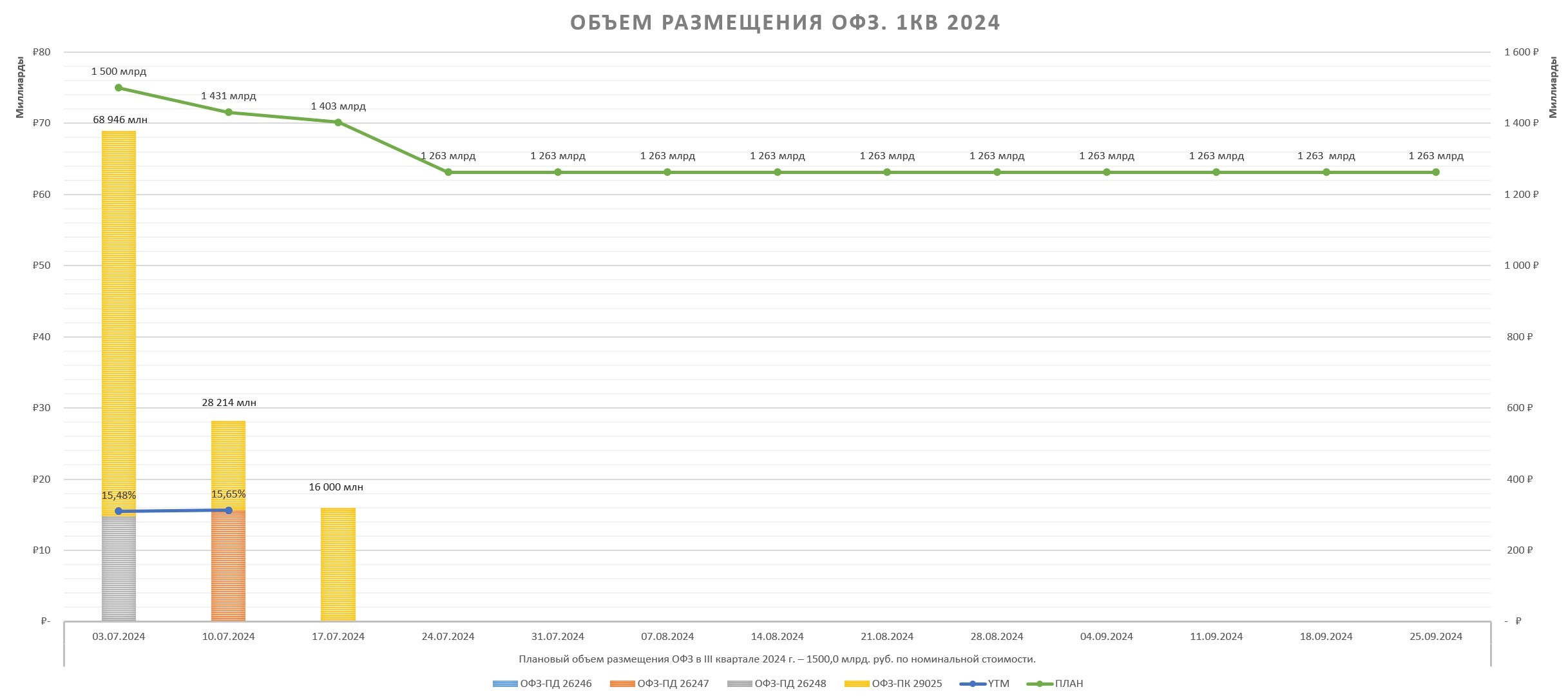 Пока что в 3кв2024 размещено 159,7 млрд руб. (10,64%) из 1,5 трлн руб. запланированных. В июле еще будет 9 аукционов, что бы выполнить план Минфину нужно занимать в оставшиеся аукционы по 149 млрд руб. Но Минфин может сильно отклоняться от плана.