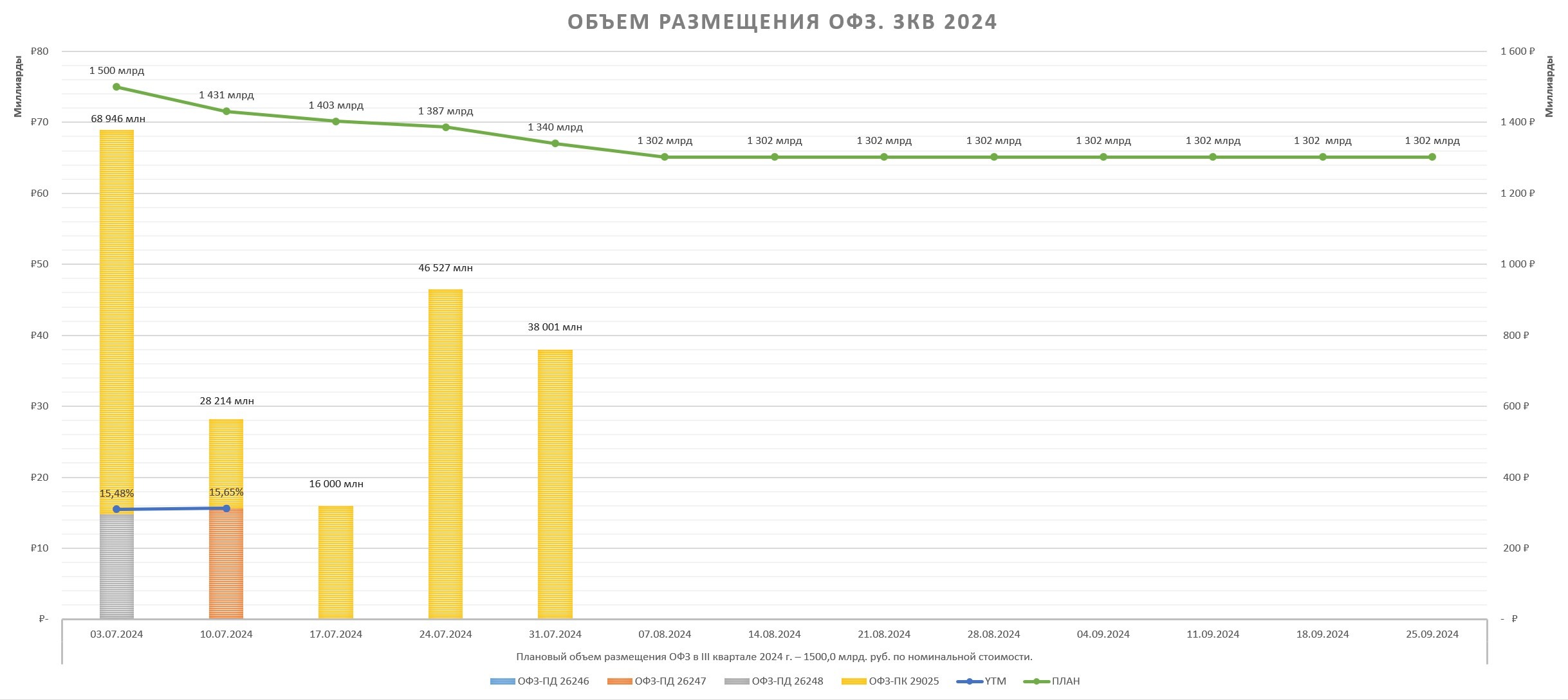 Пока что в 3кв2024 размещено 159,7 млрд руб. (10,64%) из 1,5 трлн руб. запланированных. В июле еще будет 9 аукционов, что бы выполнить план Минфину нужно занимать в оставшиеся аукционы по 149 млрд руб. Но Минфин может сильно отклоняться от плана.