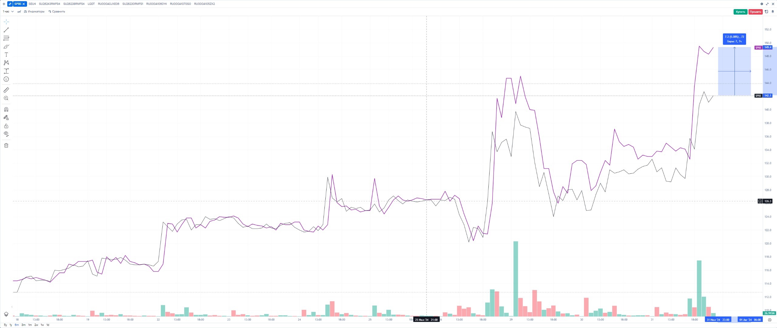 🇷🇺 Давно я не видел такого большого арбитража в $SPBE@MOEX и $SPBE@SPB размером в Δ5%-10% (Δ5-15 руб.). Последний раз такое видел осенью 2022 года.
