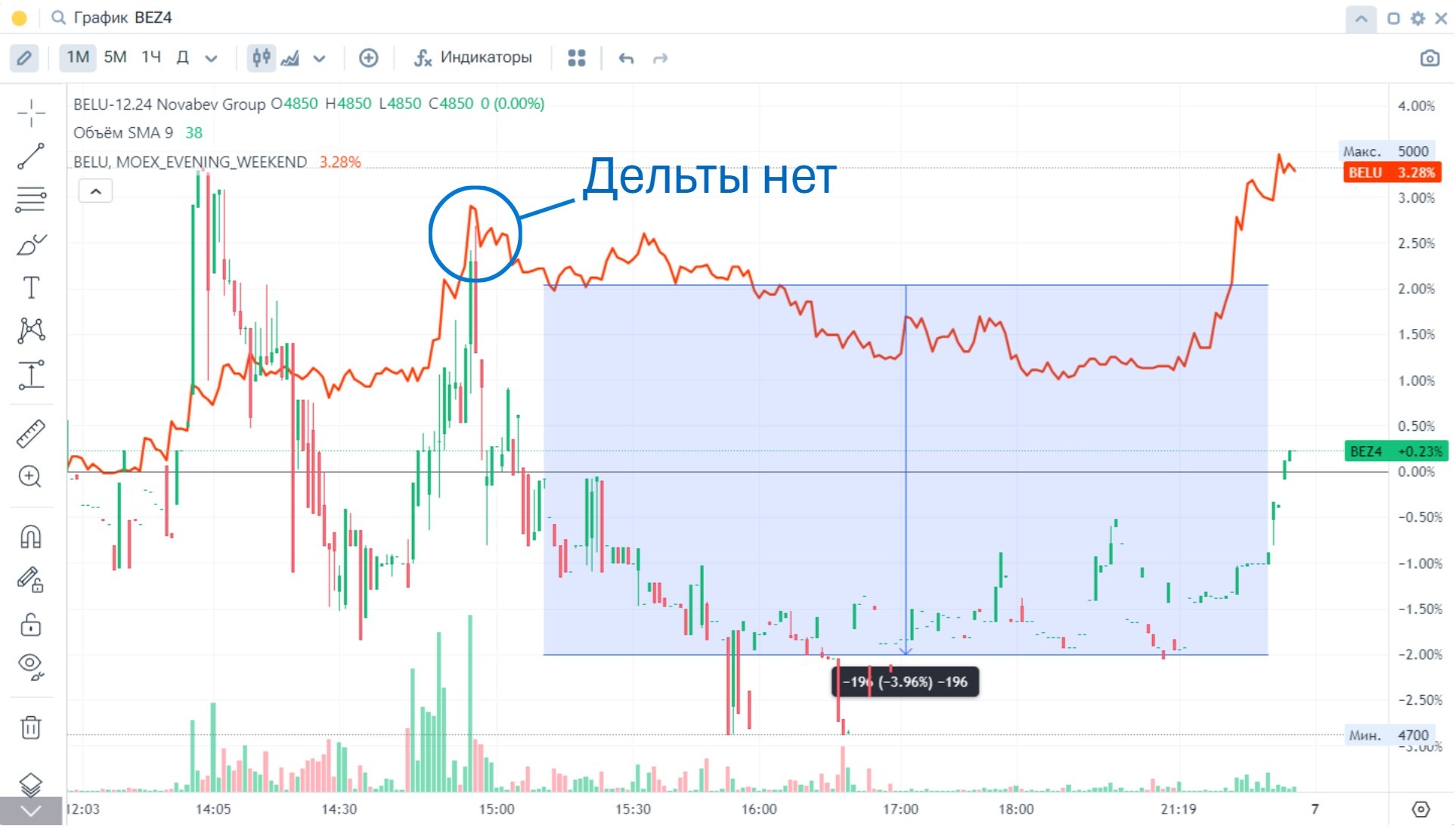 Причем ММ куда то в панике убежал из стакана. А в самом стакане было видно как арбитражники продают контракты, покрывая позицию покупкой БА. Что вызвало задерг в акции $BELU.