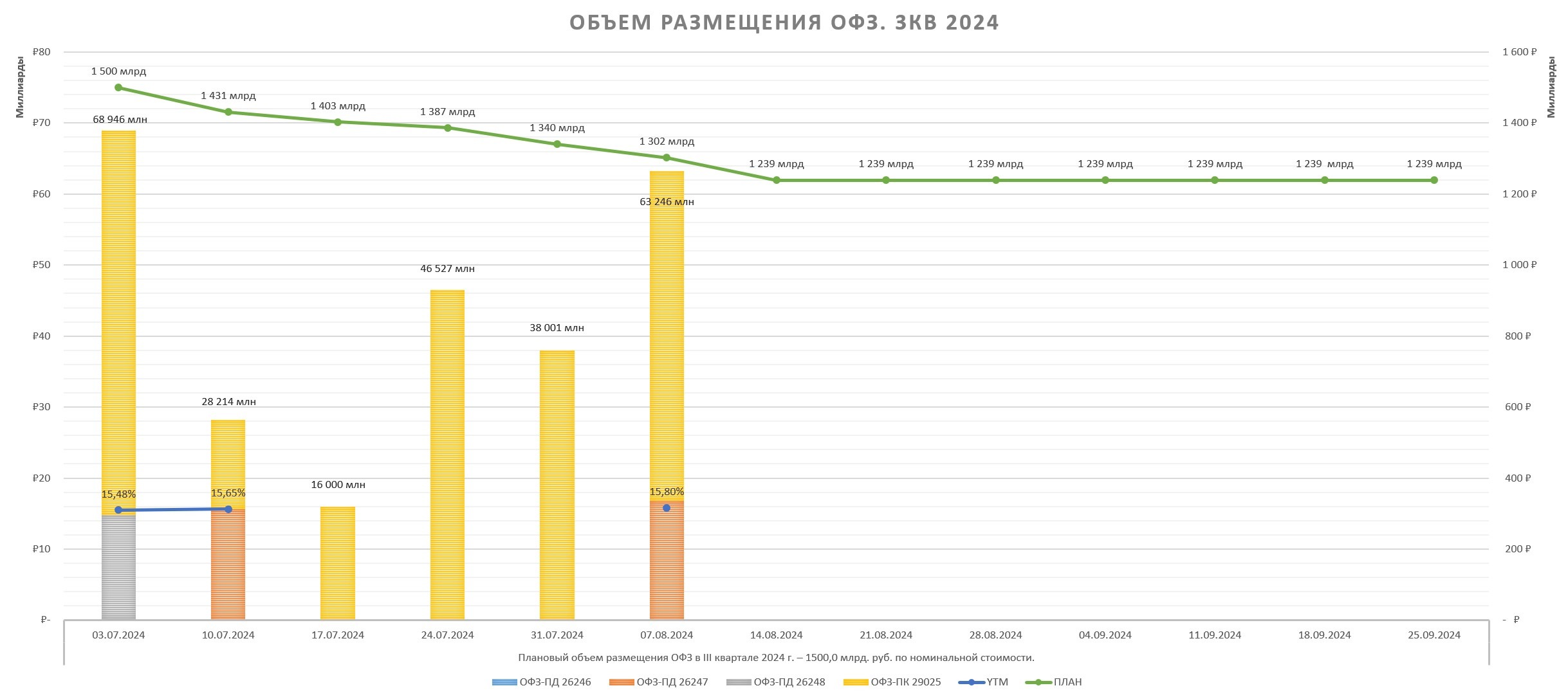 Пока что в 3кв2024 размещено 159,7 млрд руб. (10,64%) из 1,5 трлн руб. запланированных. В июле еще будет 9 аукционов, что бы выполнить план Минфину нужно занимать в оставшиеся аукционы по 149 млрд руб. Но Минфин может сильно отклоняться от плана.