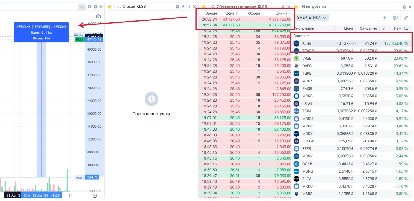 И какой-то бедолага сумел купить одну акцию $KLSB за 4 313 760,00 руб. за одну бумагу, при цене закрытия в 24,24 руб.!
