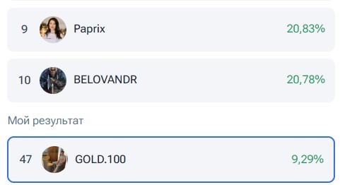 Подключил счет для участия. За сегодня получилось наковырять +9,29%. Пока на 47-м месте 🤡