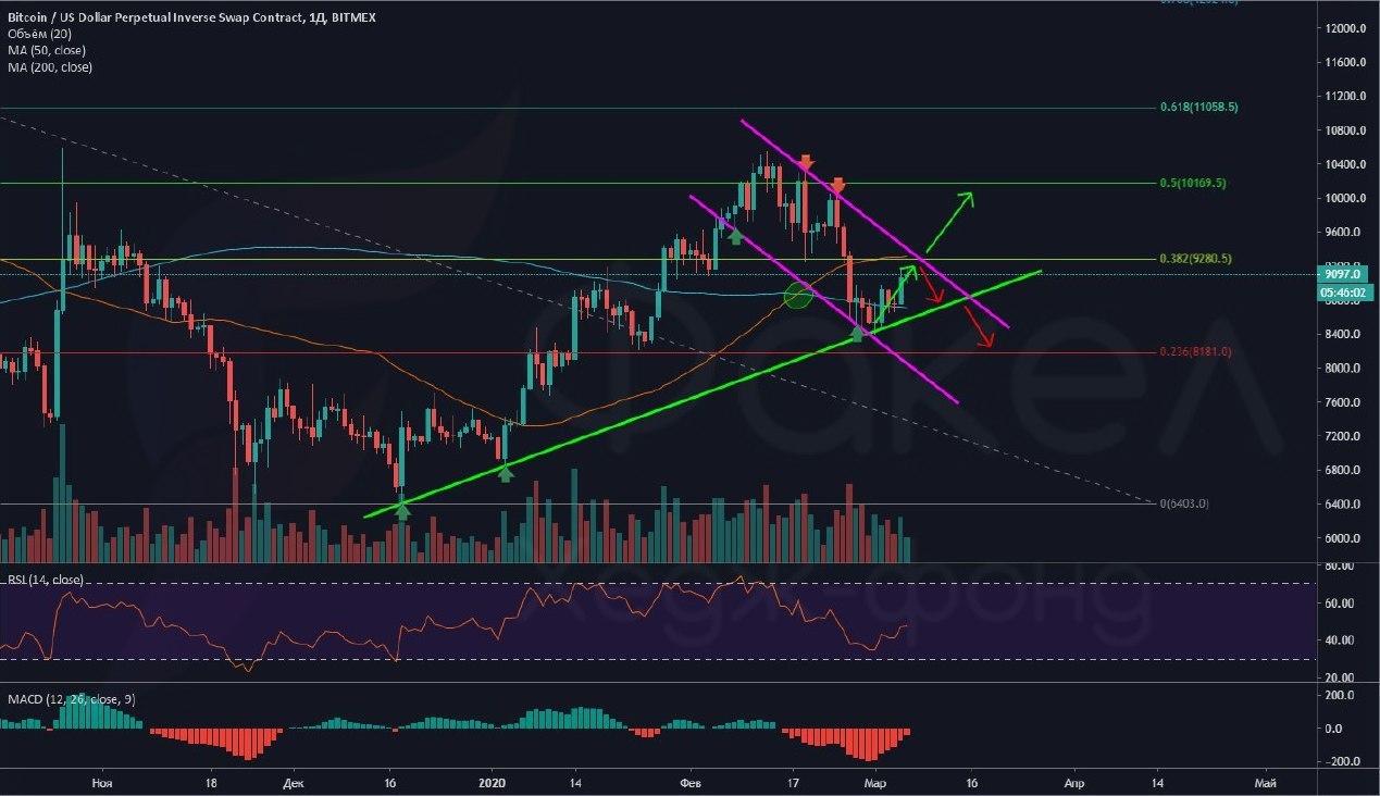 В противном случае мы откорректируемся к линии тренда, в зону 8600-8800$, где уже нужно будет смотреть на реакцию покупателя.