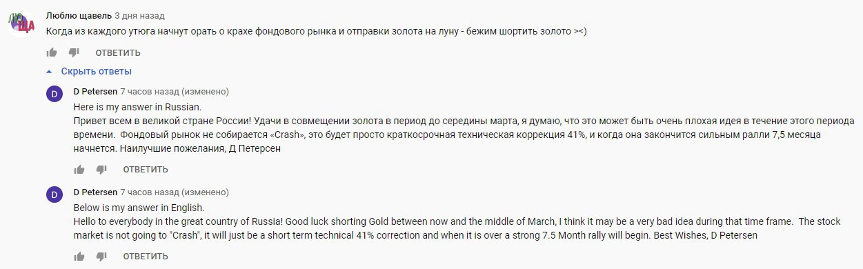 Прошлый пост составлен из кусков различных его комментариев под видео в YouTube. Там в переписке его даже попросили создать свой канал с прогнозами. Нашёл книгу Джесси Лауристона Ливермора, про которого он упомянул. Вроде как и не пропал Petersen, так как ещё отвечает. Вот даже ответил на русском языке одному из комментаторов.