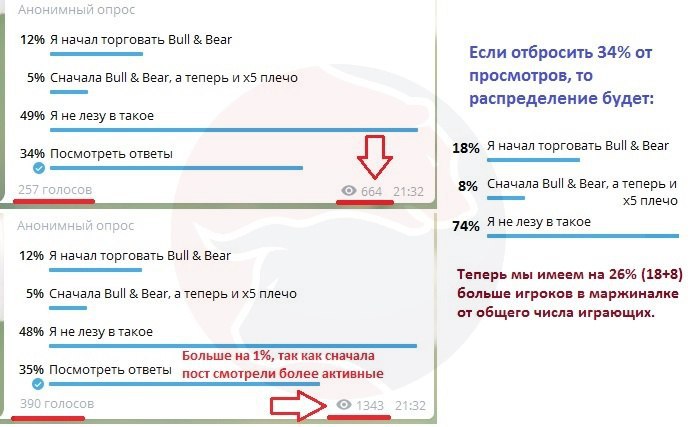 Но это всё я проводил, чтобы понять другой момент, а именно важен результат следующего голосования. Отвечать нужно только тем, кто относится к этим 26% (18+8, равнозначные в голосовнии 12% и 5% в первых двух пунктах) и начал использовать плечо и Bull&Bear в торговле только после появления этих новых инструментов.