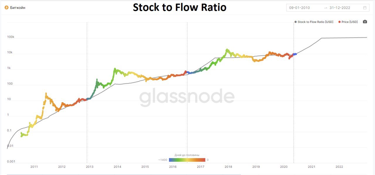 Сейчас многие ссылаются на Stock to Flow Ratio - популярная модель, предполагающая, что дефицит повышает ценность. Запас к потоку определяется как отношение текущего запаса товара (т. е. циркулирующего предложения BTC) и потока нового производства (т. е. вновь добытых BTC). Цена Bitcoin исторически следовала соотношению S/F, и поэтому многие используют эту модель, для прогнозирования будущей цены. Эта метрика была впервые придумана PlanB (подробнее).