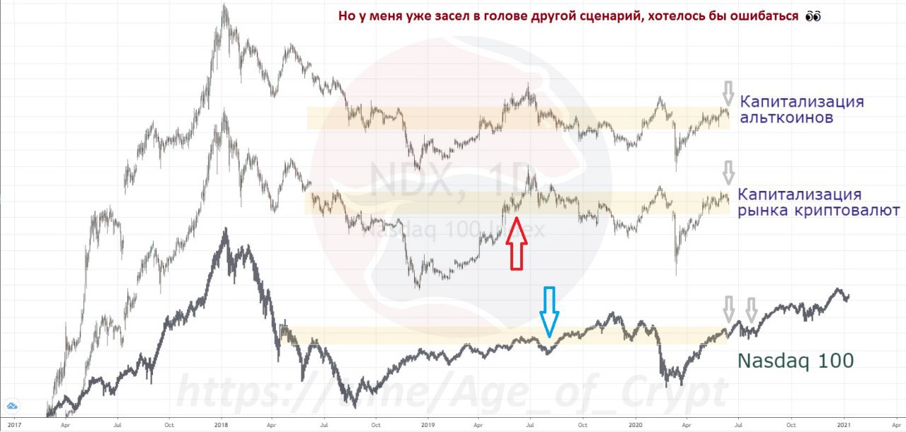 Это аналогия графика рынка криптовалют с индексом технологичных компаний Nasdaq 100 (у которого сейчас волатильность больше чем у Bitcoin).