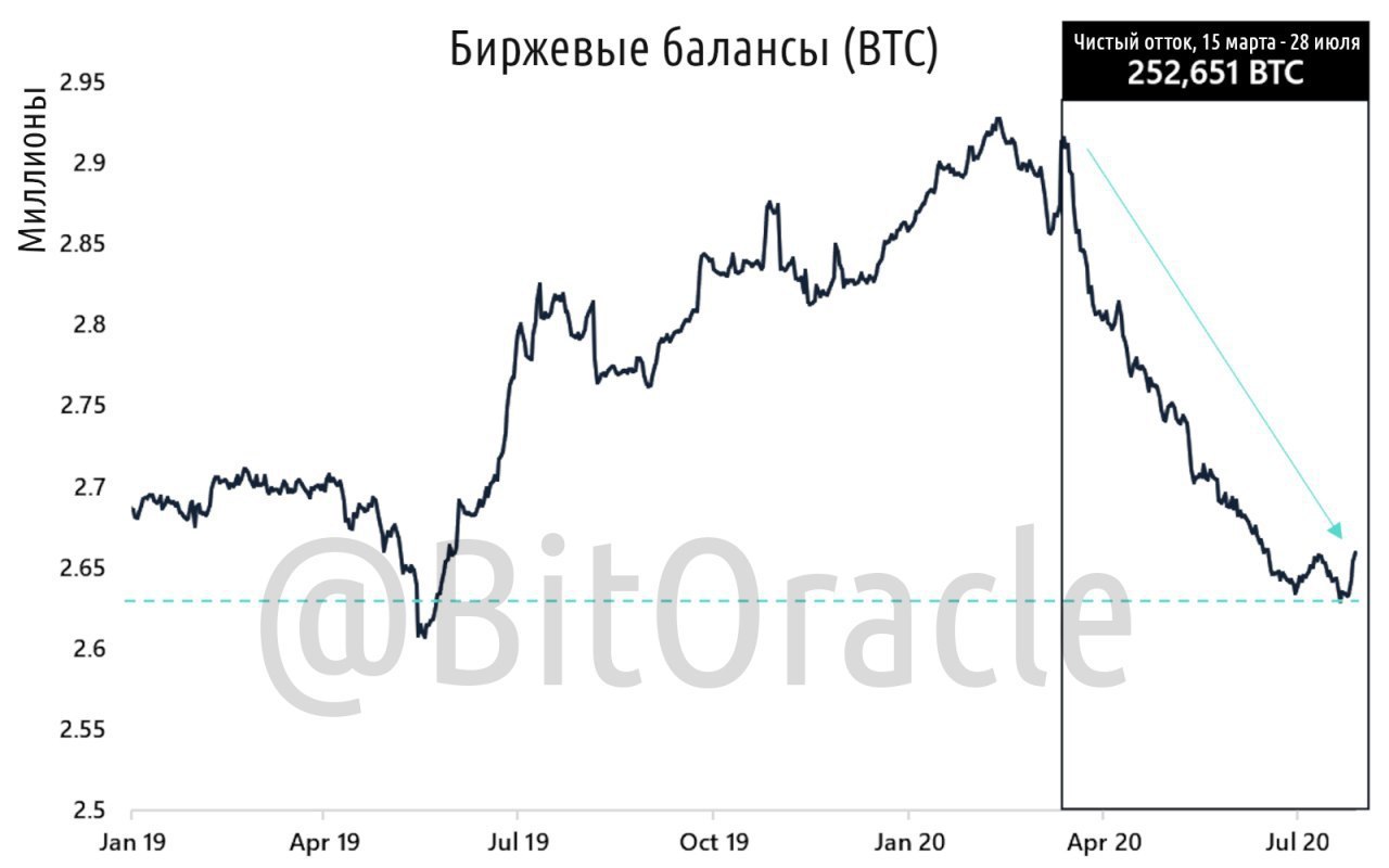 С 15 марта по 28 июля чистый отток Биткоина с бирж составил 252,651 BTC и в настоящее время находятся на уровне мая 2019 года. Ждём 10 августа...