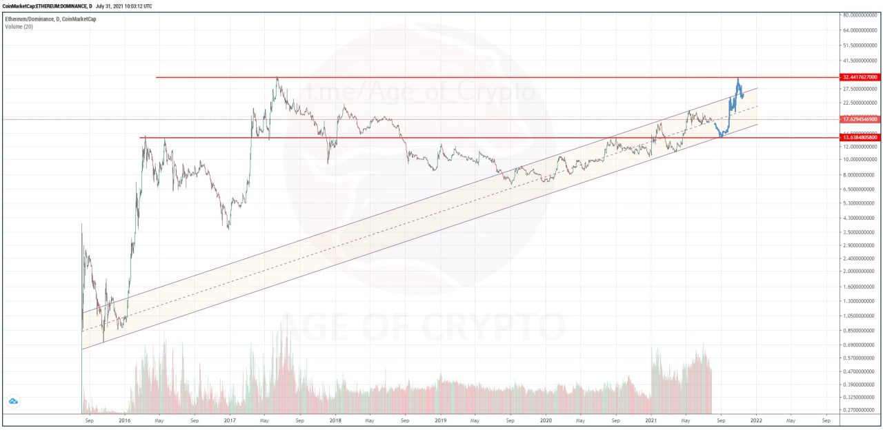 Если доминация BTC выглядит на рост, то ETH пока больше выглядит на небольшой спуск.