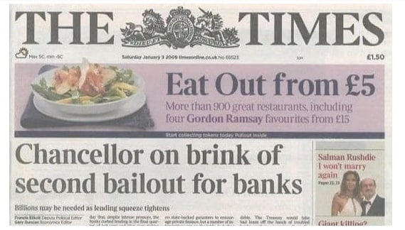 Текст представляет собой заголовок для статьи в издании The Times от 3 января 2009 года о неспособности британского правительства стимулировать экономику после финансового кризиса 2007-2008 годов. Сам Накамото никогда не комментировал значение этого текста,