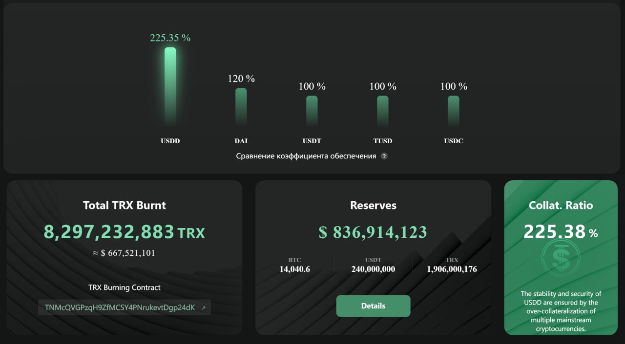Tron Foundation утверждает, что стейблкоин #USDD имеет чрезмерное обеспечение своей стабильности. Общая стоимость обеспечения USDD намного выше, чем самого USDD в обращении. Коэффициент обеспечения на текущий момент 225%, что намного превышает 120%, необходимые для DAI. Основное обеспечение в монетах TRX, и при его росте коэффициент обеспечения будет увеличиваться.