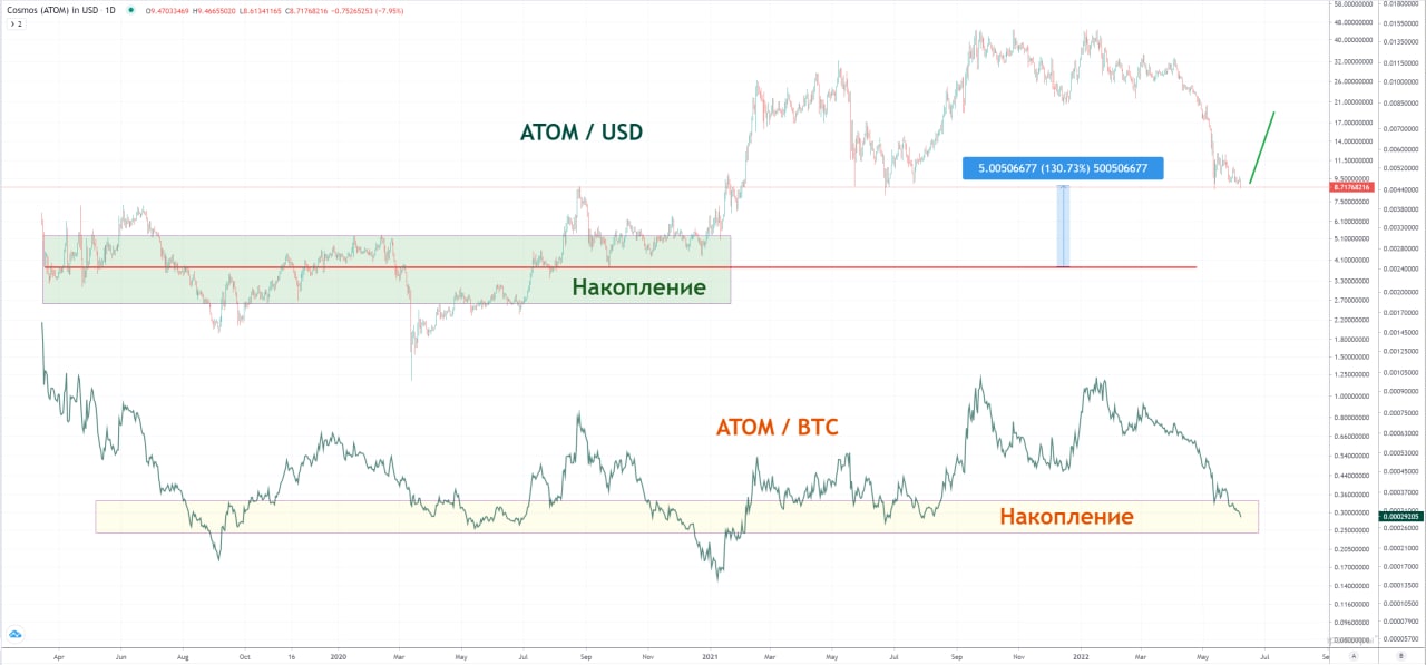 Не хотел я смотреть в альты, но ATOM очень хороший проект, с развитой инфраструктурой. Думаю он покажет отскок в первых рядах, потихоньку уже и почва для этого появляется. Текущий график к USD выглядит немного пугающим, но хороший рост возможен от текущего уровня. Мне он понравился тем, что по отношению к BTC вернулся в зону накопления. Это весь исторический график, от зоны накопления в USD там на текущий момент чуть более х2 (130%). Текущая капитализация всего $2,5 млрд., из ТОП-30 это самый недооценённый проект. Текущая цена $8.7, если удержит текущий уровень, жду волну к $20, если не удержит, то на $6.