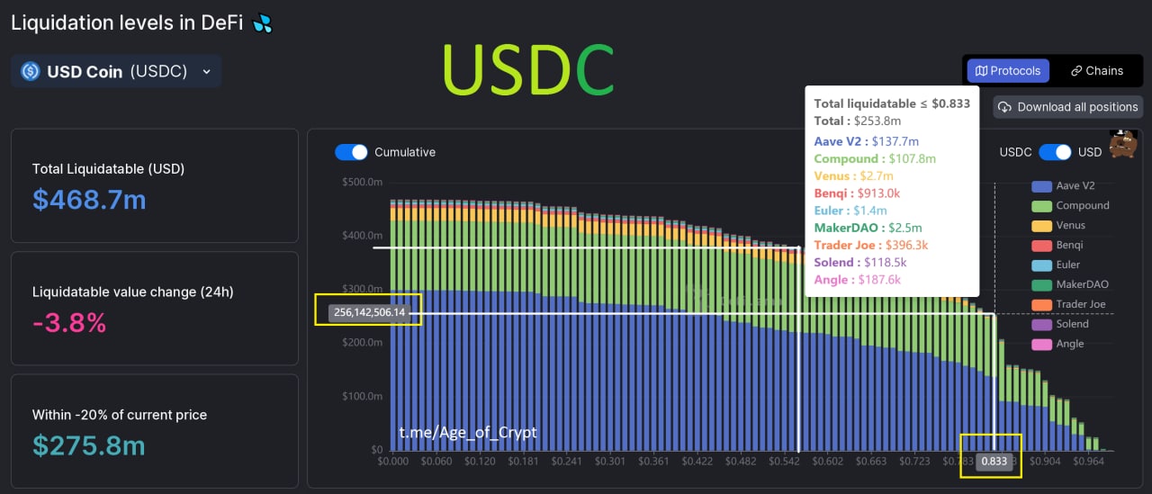 ▫️#USDC, ❗️если цена отвяжется от паритета и упадёт на 0.83$, то в DeFi платформах будет ликвидировано $250 млн. залоговых USDC. При спуске на 0.56$ почти $400 млн. 😱 Суммарно залочено 466 млн. USDС. Если будет паника и USDC отвяжется от 1:1, то большого смысла опускать ниже 0.63$ нету, то есть можно будет смело откупать на 0.6-0.85$ в надежде на возврат 1:1.
