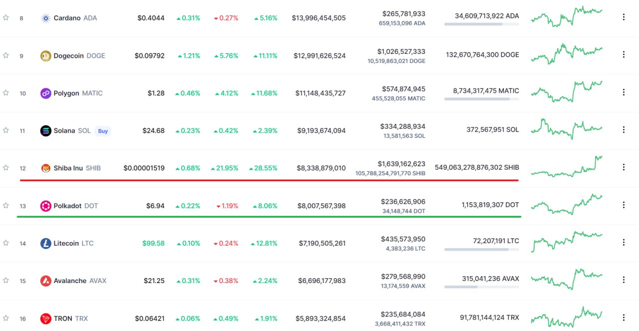 Монета Shiba Inu занимает 13-ю строчку Сoinmarketcap с капитализацией