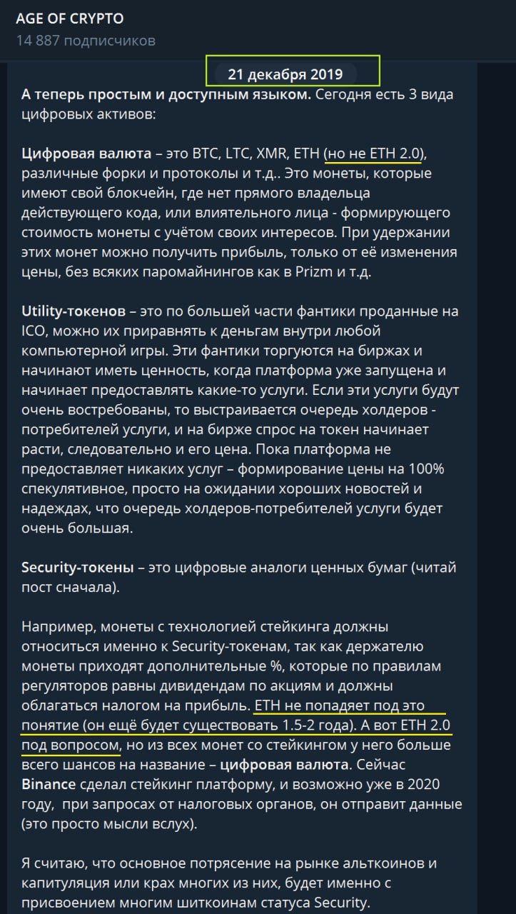 Если в 2019 году у меня были сомнения про статус ETH 2.0, то сегодня я практически уверен, что его признают незарегистрированной ценной бумагой. JPMorgan высказал мнение, что Конгресс США может признать Ethereum новым классом активов и он сможет занять промежуточное положение между товаром и ценной бумагой. Очень вероятно SEC скоро начнёт и какой-то процесс, а решение вынесет ближе к 2024 году.