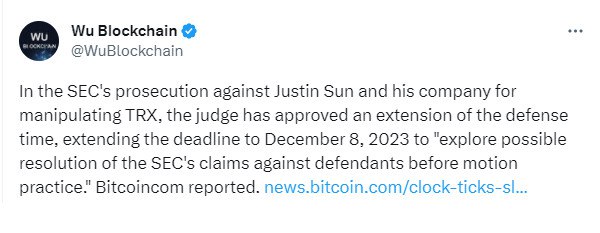 ⚖️ В судебном преследовании SEC против Джастина Сана и его компании за манипулирование TRX судья одобрил продление времени для защиты, продлив крайний срок до 8 декабря 2023 года, чтобы изучить возможное досудебное разрешение претензий SEC против ответчика.