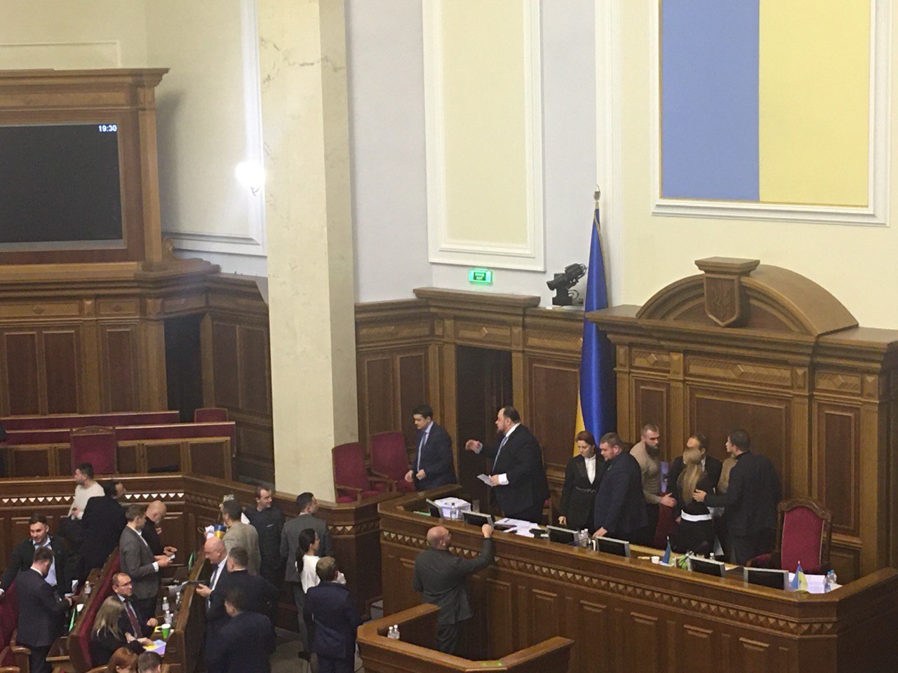 ОПЗЖ створили «корок» до трибуни, де виступає спікер Ради Дмитро Разумков. Після 2 хвилин перемовин Шуфрича і слуг, Розумков бере слово і «виховує» депутатів, що якщо раніше домовилися розглядати земельний законопроект за регламентом, то цього треба дотримуватися. «Ви сподівалися, що ми його порушимо? Ні! Не порушили! Ітимемо по регламенту і рішення прийматимуться більшістю! Саме така демократія. Комітет розглянув поправки до законопроекту, їх подали депутатам у сесійну залу - і всі мали змогу з ними ознайомитися і будемо голосувати. Хтось хоче піару, щоб заробити бали. Але давай е без цього. Давайте виконувати обіцянки, які давали. Хай рішення прийме парламент».