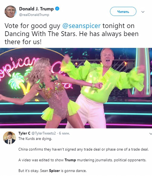 Дональд Трамп призвал голосовать за своего бывшего пресс-секретаря Белого Дома Шона Спайсера в «Танцах со звёздами».