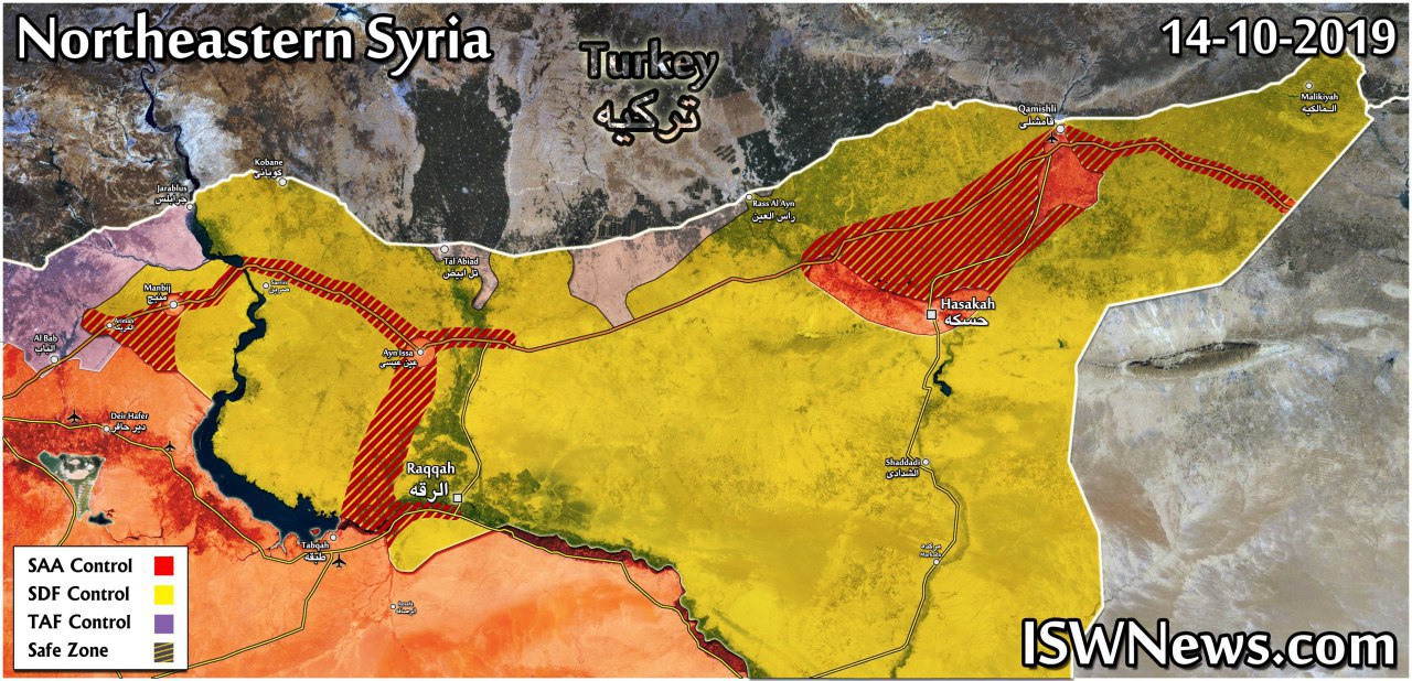 Сирийские войска заняли ряд крупных городов на северо-востоке - Аль-Камышли ("столица" курдской автономии), Аль-Хасака, Ат-Табка, Аль-Ярубийя (граница с Ираком), Таль-Хамис (граница с Ираком) и Таль-Тамр, включая авиабазу "Табка", одноимённую дамбу и военную базу 93-й бригады у города Ракка.