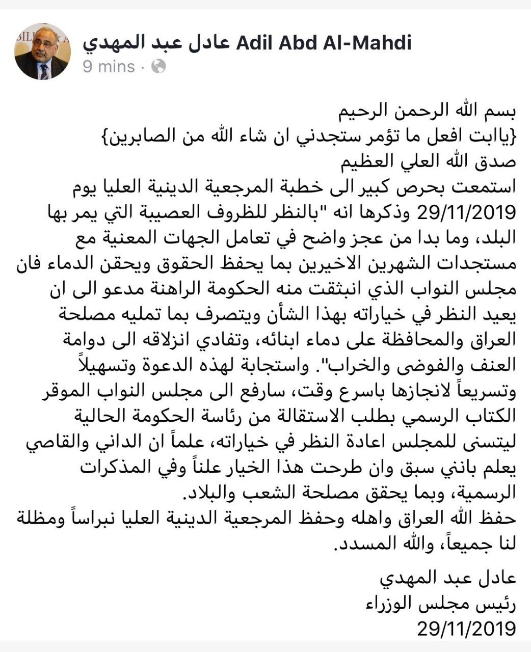 Кроме того, я убеждён, что ему "подсказал" уйти духовный лидер иракских шиитов, верховный аятолла Али Ас-Систани, стараясь самоустраниться от протестов и позиционировать себя как защитник людей и союзник уличных демонстрантов в противовес как Багдаду, так и Ирану.