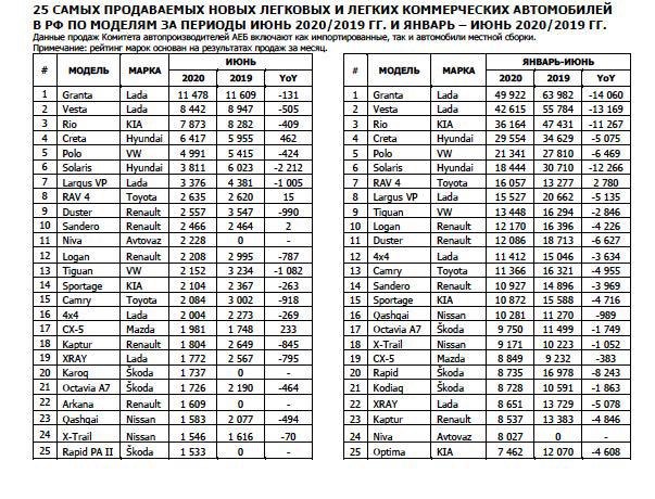 В июне 2020 года, как известно из отчета АЕБ, в России было продано 28020 автомобилей Lada (-9%), а также 17 007 машин KIA (-12%), 13 373 автомобиля Hyundai (-18%), 10 704 «Рено» (-10%) и 7553 ед. машин марки Volkswagen (-20%). Июньский рейтинг самых востребованных автомобилей в России возглавляет Lada Granta — 11 478 реализованных машин. Топ-5 моделей составили также Lada Vesta — 8442 ед., KIA Rio — 7873 авто, Hyundai Creta — 6417 машин и Volkswagen Polo — 4991 авто.