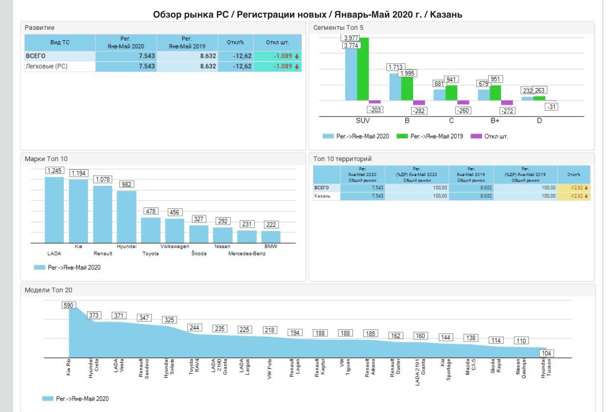 В Казани за период января-мая 2020 года было продано 7543 легковых автомобиля. Объем продаж на местном авторынке упал на 12,6% к прошлогоднему результату — 8632 реализованных машины.