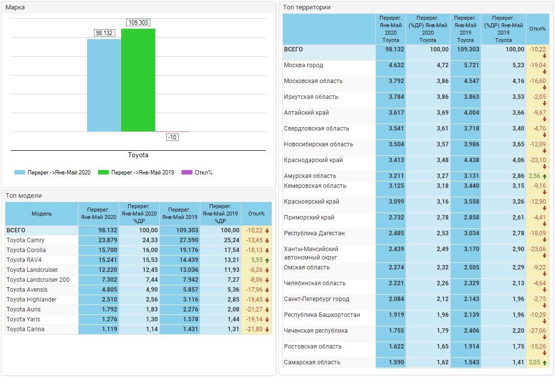 В России за первые пять месяцев 2020 года было продан 98 132 подержанных автомобиля Toyota. Это на 10% меньше количества машин этой марки, перепроданных годом ранее — 109 303 ед.
