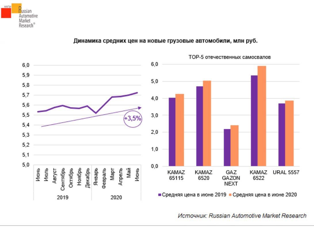 Агентство Russian Automotive Market Research провело анализ средних цен на новые грузовые автомобили за июнь 2019 г. – июнь 2020 г.
