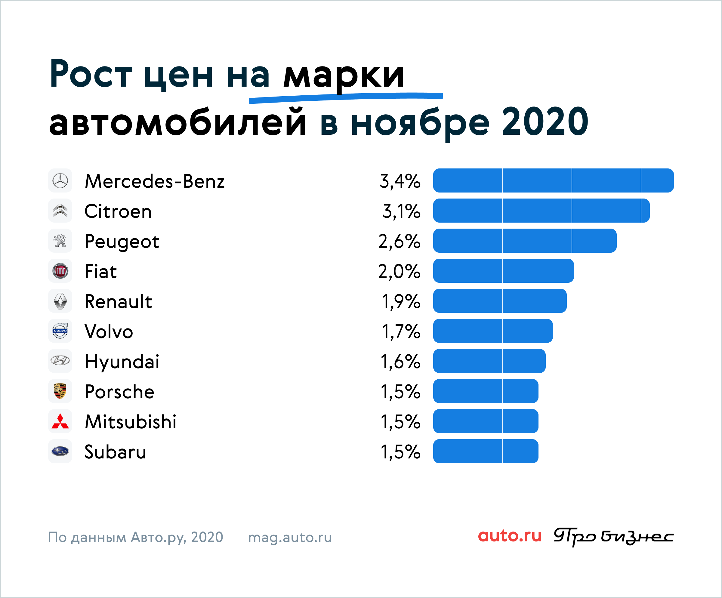 В ноябре цены увеличили 26 производителей — в среднем, на 1,3%. Причём Mercedes-Benz уже третий месяц подряд попадает в десятку брендов, чьи цены растут сильнее всего. Второй раз подряд в этом списке оказываются Renault и Subaru.