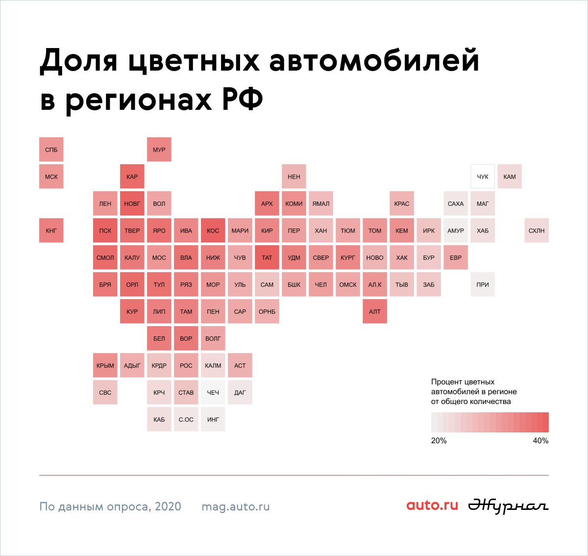 Завершающий пост о цветах автомобилей, аналитики авто.ру прошлись по регионам , в каком регионе доля цветных автомобилей выше, Татарстан посмелее в выборе цветов, юг и восток очень консервативны.