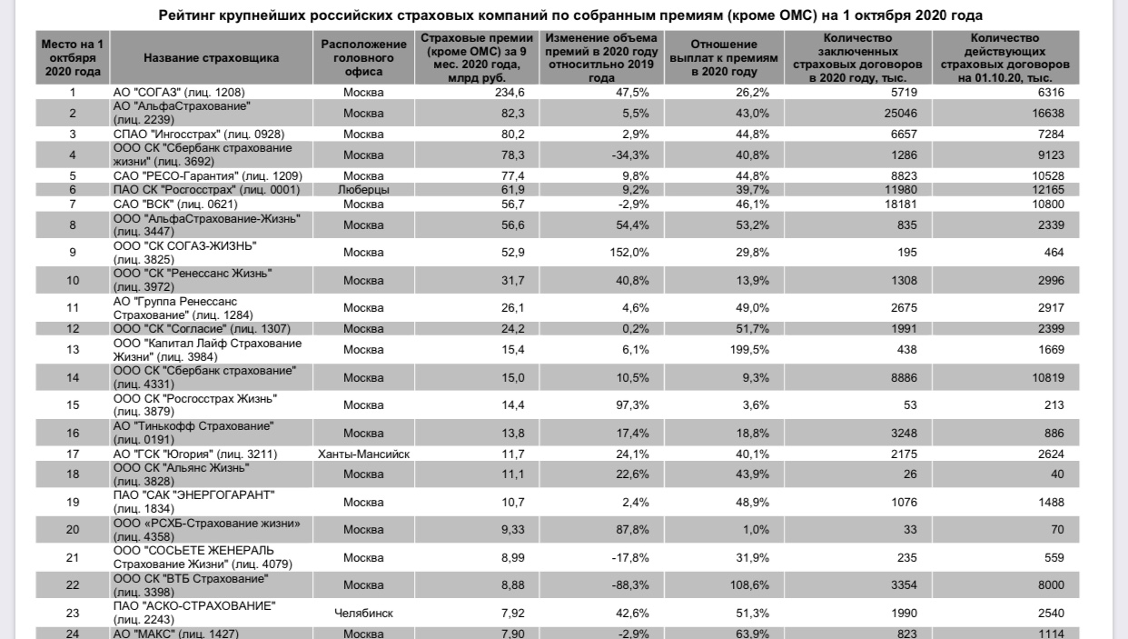 Крупнейшие страховые компании на 1 октября 2020 года📍