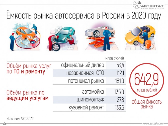 В 2020 году общая ёмкость российского рынка сервисных услуг для легковых автомобилей превысила 600 млрд руб. К такому выводу пришли специалисты аналитического агентства «АВТОСТАТ» . Так, в 69 наиболее крупных регионах РФ, где числится более 97% парка легковых автомобилей, этот показатель суммарно составил 642,9 млрд рублей.