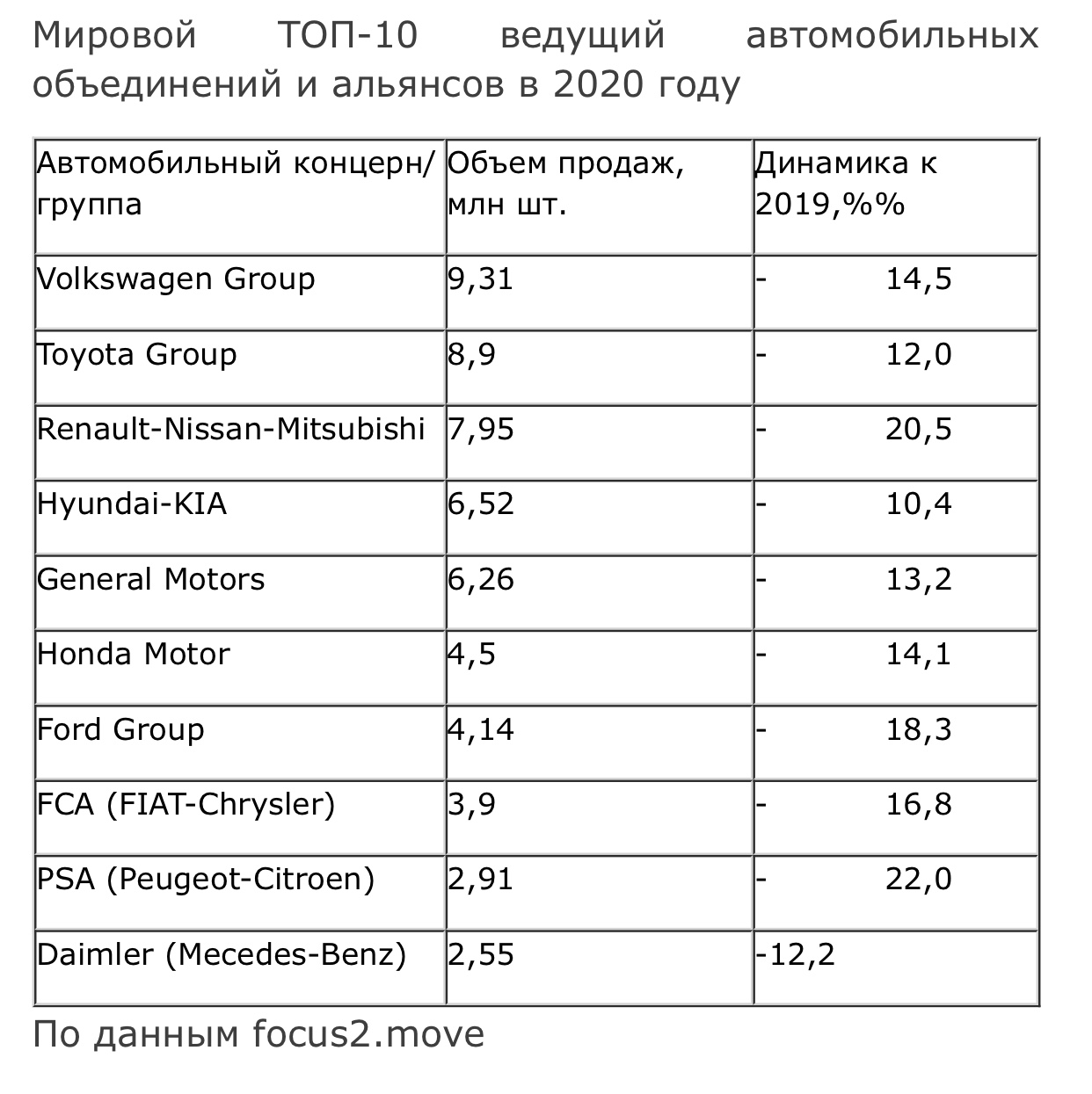 Уникальная ситуация, сложившаяся в 2020 году, в связи с известными событиями, не обошла стороной автомобильный рынок легковых автомобилей. Все автопроизводители, за редким исключением, снизили объем продаж. Диапазон снижение от минус 10% (у корейского Hyundai-KIA) до 22% (французский PSA).