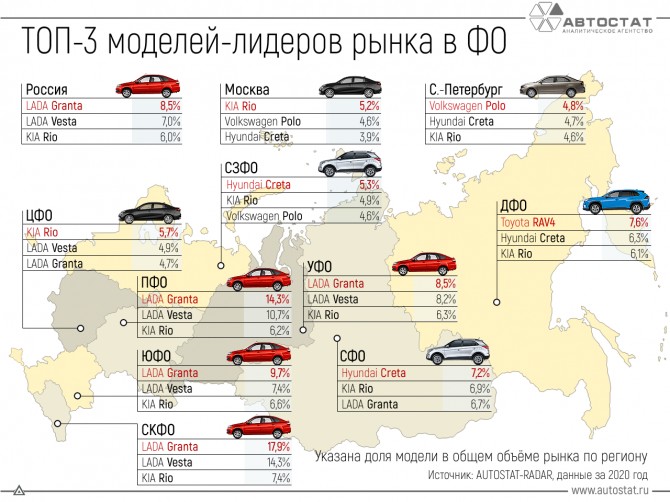 Специалисты аналитического агентства «АВТОСТАТ» провели исследование рынка новых легковых автомобилей в России по итогам 2020 года и определили тройку лидеров в каждом из федеральных округах, а также в Москве и Санкт-Петербурге. Согласно результатам исследования, в 8 округах РФ бестселлерами рынка являются всего лишь 4 модели: LADA Granta, KIA Rio, Hyundai Creta, Toyota RAV4. А в некоторых из них LADA Vesta и Volkswagen Polo попадают в ТОП-3.