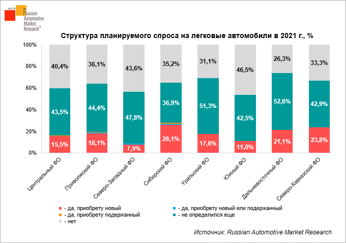 Значительная доля компаний еще не определились с покупкой легковых автомобилей в 2021 году. Самая высокая доля таких респондентов – в Уральском и Дальневосточном федеральных округах– 51,3% и 52,6%.